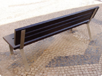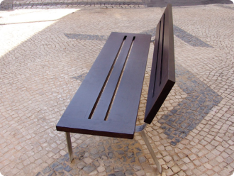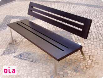 Banco com dois pés em barra de aço inoxidável e madeira tropical.