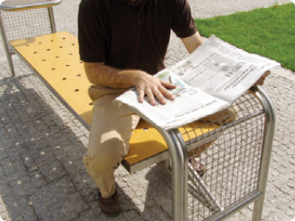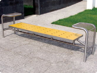Bench made of stainless steel grade 316L, HPL and galvanized steel net.