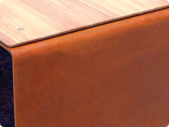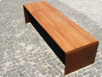 Banco construído em chapa de aço patinável (CORTEN), revestido em HPL.